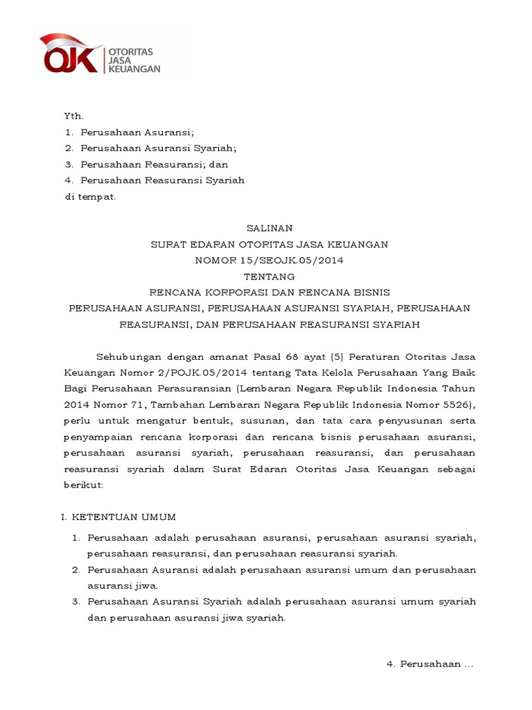 SE OJK No 15 Tahun 2014 Tentang Rencana Bisnis Dan Rencana